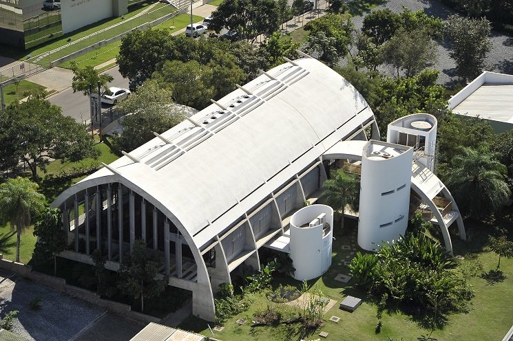Construído em formato ogival, numa referência explícita às casas dos povos do Xingu, consideradas exemplares em termos de arquitetura bioclimática, o prédio em concreto aparente, com fachadas de vidro, tem revestimento externo com dupla camada para captar água de chuva que é estocada e reutilizada, além de melhorar o conforto térmico, reduzindo a temperatura interna, aproveita ao máximo a luz natural.