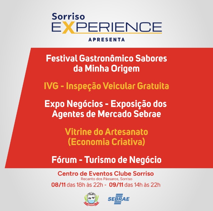 O Serviço de Apoio às Micro e Pequenas Empresas do Estado de Mato Grosso (Sebrae/MT) promove, nesta sexta-feira (08) e sábado (09), a primeira edição do evento ‘Sorriso Experience’, com diversas atividades simultâneas para a população do município e região, no Centro de Eventos Clube Sorriso.