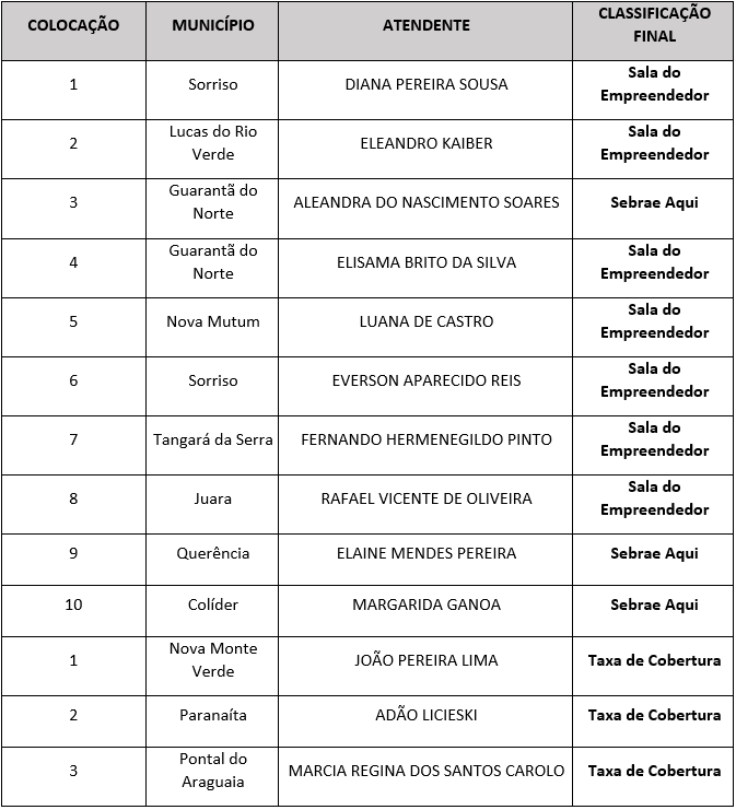 Para esta segunda edição da premiação, foram avaliadas as categorias Atendimento Geral e Pequenos Negócios Atendidos. A categoria de “Atendimento Geral” teve 10 atendentes premiados com as maiores pontuações referente aos volumes de atendimentos realizados, sendo sete deles atendentes do CAE e/ou Sala do Empreendedor e três das parcerias Sebrae Aqui.